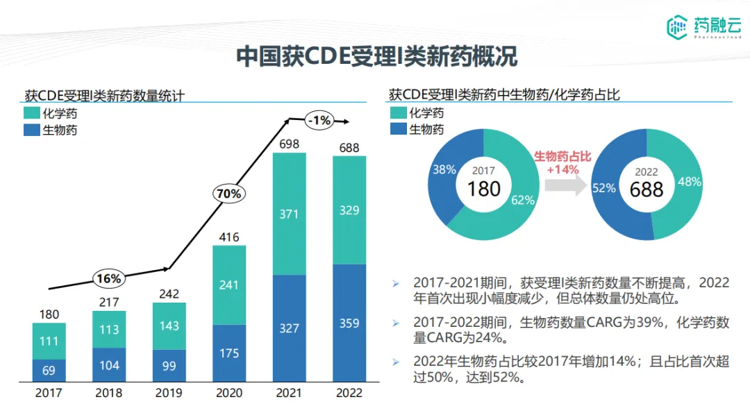 根据药融云2022年中国I类新药靶点白皮书,2017-2021期间,获受理I类新药数量不断提高,2022年首次出现小幅度减少,但总体数量仍处高位。2017-2022期间,生物药数量CARG为39%,化学药数量CARG为24%。2022年生物药占比较2017年增加14%;且占比首次超过50%,达到52%。
