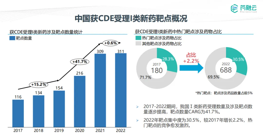 从靶点上来看,2017-2022期间,我国I类新药受理数量及涉及靶点数量逐步提高,靶点数量CARG为41.7%。2022年靶点集中度为30.5%,较2017年增长2.2%,热门靶点的竞争愈发激烈。