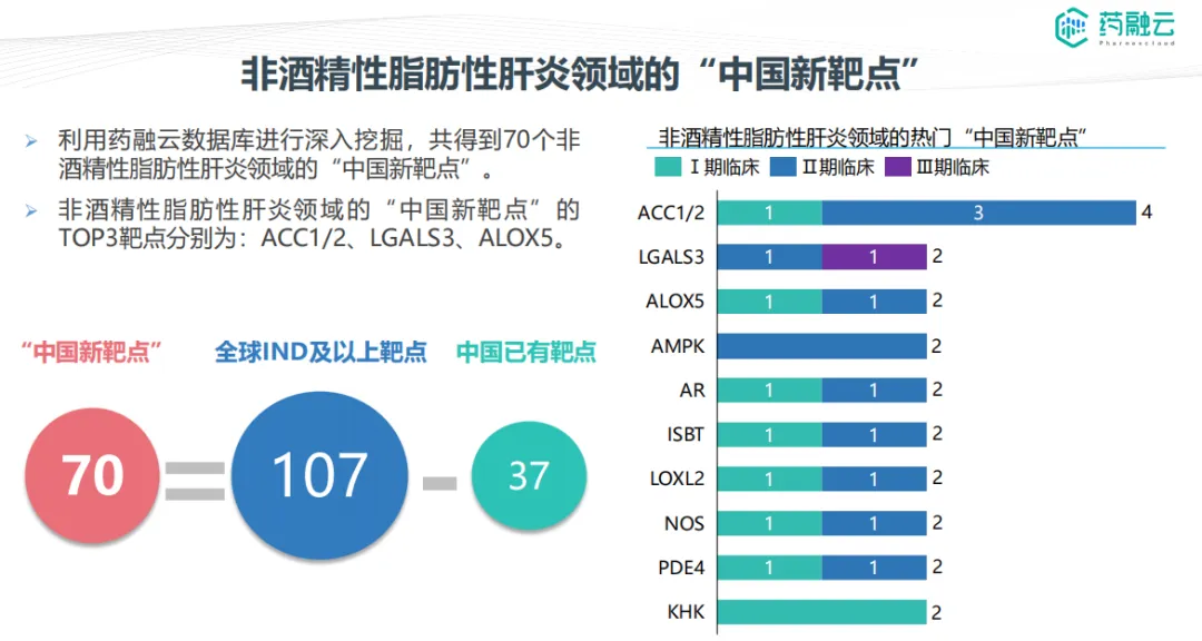 非酒精性脂肪性肝炎(NASH,现改名为代谢相关脂肪性肝病,MAFLD)与肥胖、胰岛素抵抗、2型糖尿病、高脂血症等代谢紊乱关系密切,好发于中年特别是超重肥胖个体,其临床表现为脂肪性肝炎、脂肪性肝硬化。利用药融云数据库进行深入挖掘,共得到70个非酒精性脂肪性肝炎领域的“中国新靶点”,其中TOP3靶点分别为:ACC1/2、LGALS3、ALOX5。