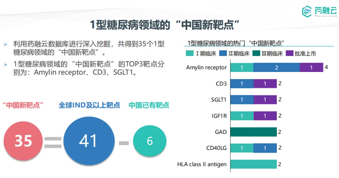 糖尿病是指持续的血液中高葡糖糖水平为特征的代谢性疾病,可能引发许多的继发性疾病,例如:心血管疾病、视网膜病变、神经系统疾病等。1型糖尿病患者无法产生足够的胰岛素,目前病因尚未完全阐明,与遗传、免疫失调和环境等因素有关。全球发病率约为15例/10万人,患病率为9.5/万人。利用药融云数据库进行深入挖掘,共得到35个1型糖尿病领域的“中国新靶点”,TOP3靶点分别为:Amylin receptor、CD3、SGLT1。