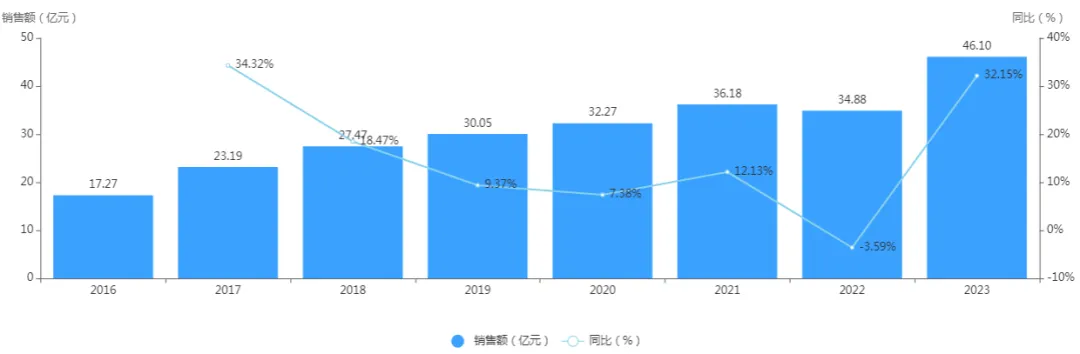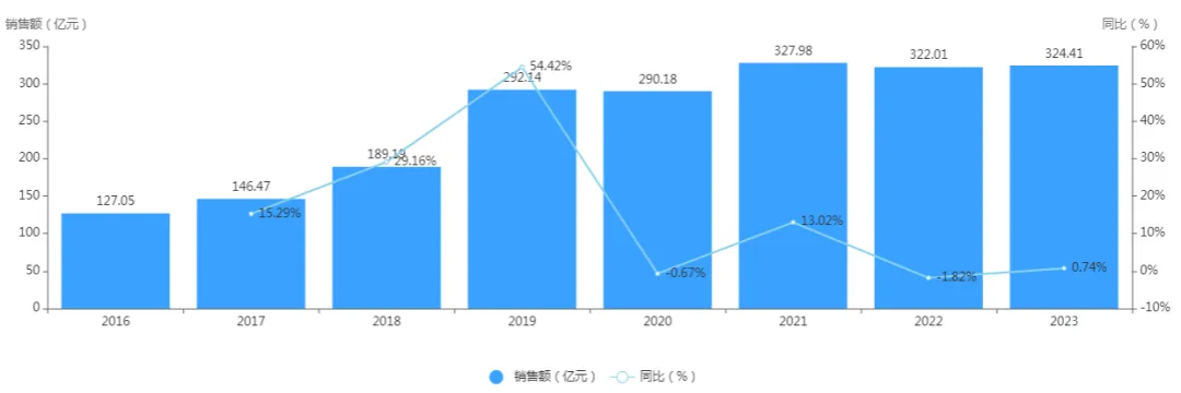 图1 2016年—2023年,零售端注射剂年销售额 图片来源:药智数据