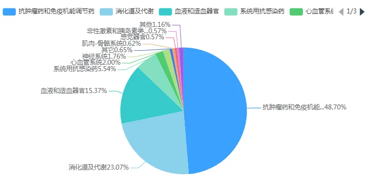 ATC分类销售额方面,2016年—2023年,抗肿瘤药和免疫机能调节药占比第一、为48.70%,第二消化道及代谢23.07%,第三血液和造血器官15.37%。