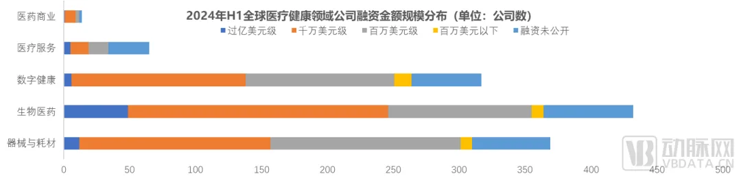 全球范围内,2024年H1的医疗健康产业融资按细分领域区分,包含生物医药类融资432次、合计157亿美元;器械与耗材类融资469次、合计57亿美元;数字健康类融资317次、合计46亿美元;医疗服务类融资65次、合计43亿美元;医药商业类融资14次、合计4亿美元。