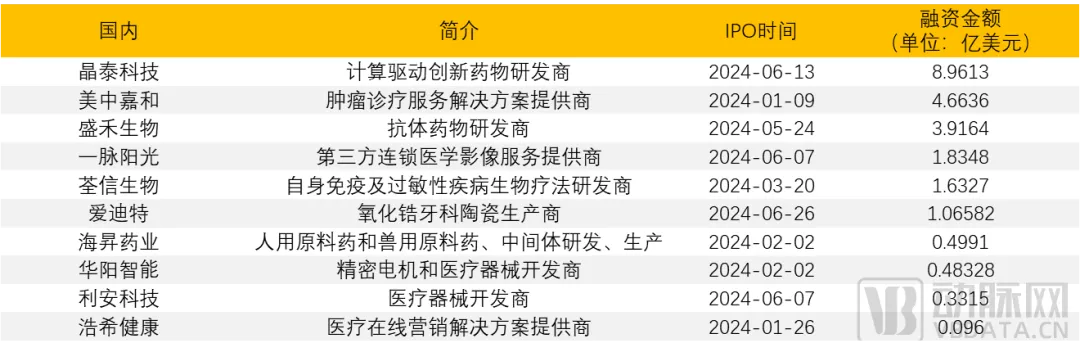 2024年H1国内医疗健康产业IPO融资TOP 10 数据来源:动脉橙数据库