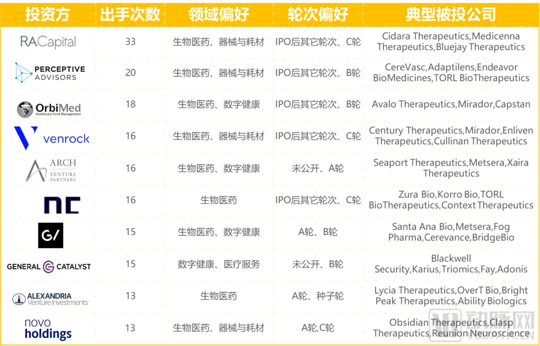 2024年H1全球医疗健康产业投融资活跃机构TOP 10 数据来源:动脉橙数据库