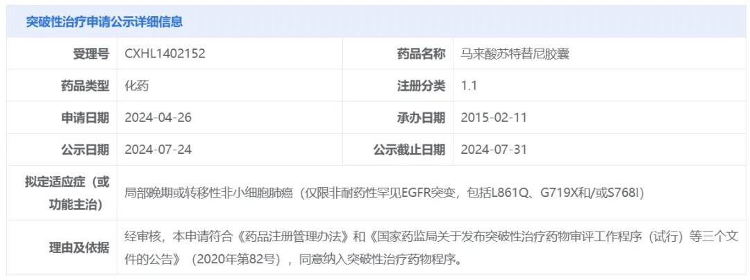 7月24日,中国国家药监局药品审评中心(CDE)官网公示,由江苏苏中药业等联合申报的马来酸苏特替尼胶囊拟纳入突破性治疗品种,针对局部晚期或转移性非小细胞肺癌(仅限非耐药性罕见EGFR突变,包括L861Q、G719X和/或S768I)。