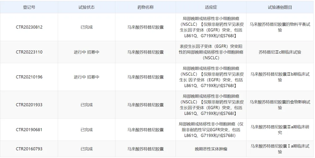 根据中国药物临床试验登记与信息公示平台,苏特替尼胶囊的两项(2b期和2c期)临床研究正在进行中。其中2b期研究针对局部晚期或转移性非小细胞肺癌(仅限非耐药性罕见EGFR突变,包括L861Q、G719X和/或S768I);2c期研究针对EGFR突变阳性的局部晚期或转移性非小细胞肺癌。