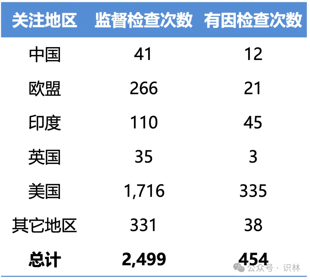 上一财年度执行的有因检查次数,包括每各关注地区;