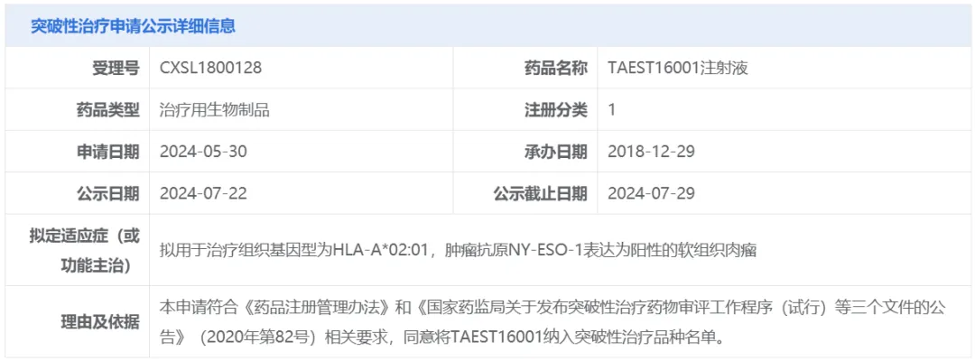 7月22日,中国国家药监局药品审评中心(CDE)官网最新公示,由广东香雪精准医疗技术有限公司申报的TAEST16001注射液拟纳入突破性治疗品种,拟用于治疗组织基因型为HLA-A*02:01,肿瘤抗原NY-ESO-1表达为阳性的软组织肉瘤。