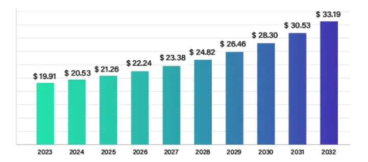之所以艾伯维如此看重IBD疗法的开发,是由其市场规模决定的。分析师预测,预计IBD市场将呈现强劲扩张的态势,市场体量将以5.5%的复合年增长率从2023 年的 199.1 亿美元增加到 2032 年的约 331.9 亿美元(图1)。