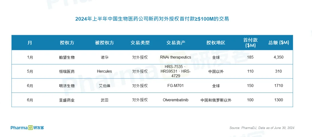 获得1亿美元以上首付款的对外授权交易中,恒瑞的三款产品是当下最热的GLP-1类减重药物,明济生物的抗TL1A抗体是下一代的潜在炎症性肠病疗法,舶望生物则凭着RNAi药物管线获得了制药巨头诺华的青睐。