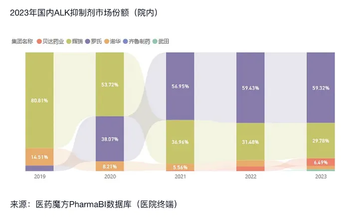 市场份额上,辉瑞早已难以回归曾经的优势地位。医药魔方PharmaBI数据显示,2023年,罗氏ALK抑制剂市场份额占比最大,达59.32%,辉瑞其次占据29.78%。