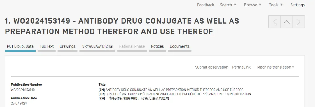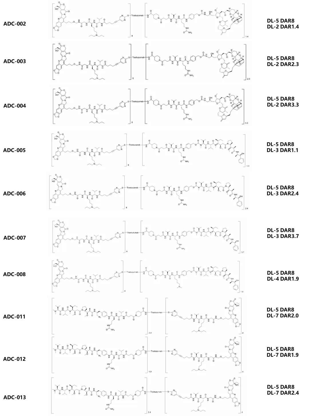 据公布文件内容:发明名称: 一种抗体药物偶联物、制备方法及其应用发明内容: 本发明提供了一种包含两个或多个不同作用机制的生物活性分子的抗体药物偶联物。以给药剂量明确的ADC为原料,通过分子中活性位点,偶联合适数量的其他靶点的毒素-连接子(drug linker),形成新的抗体药物偶联物。这样,两种不同作用机制的生物活性分子,可在有效性和安全性数据的指导下,灵活调控偶联到抗体上的比例,得到的新的ADC,成药性大大增加。具体来看,宜联专利中的采用的毒素主要有5种,其中主要采用的连接子毒素仍然为,其自主开发的三肽TMALIN 连接子,以及拓扑异构酶抑制剂毒素YL0014(C24),其通过半胱氨酸迈克尔加成的方式进行偶联。