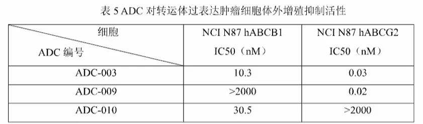 耐药模型中,艾日布林 ADC-009(单毒素)在人 ABCB1过表达的 N87肿瘤细胞失去活性,喜树碱 ADC-010(单毒素)在人 ABCG2 过表达 N87细胞失去活性,而双毒素分子ADC-003在上述两种转运体过表达 N87细胞中均保持良好活性,从而有望解决现有药物因这两种转运体过表达而引起的耐药问题。