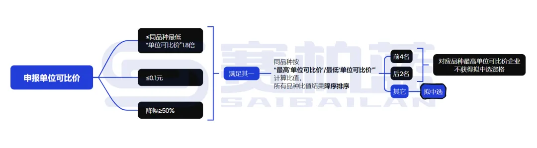 第九批国采通过计算同品种最高与最低单位可比价比值,对所有品种的比值结果进行降序排列,按照“前4名和后2名”划定,相关品种最高单位可比价企业将无法获得拟中选资格(降幅≥30%或单位可比价≤1元的除外)。