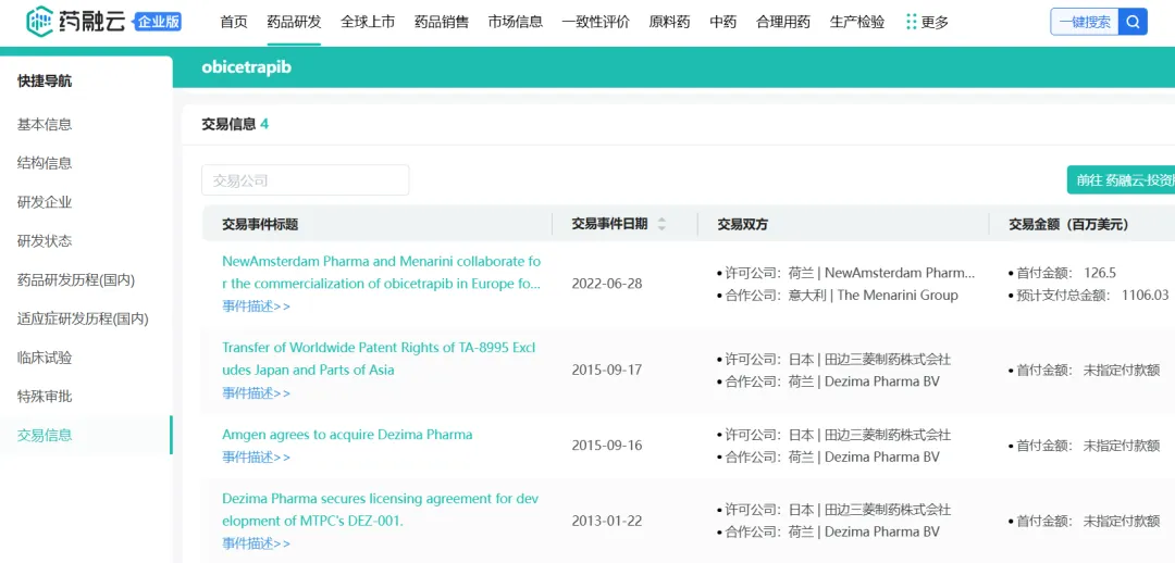 安进的AMG 899(Obicetrapib)前称为TA-8995,由安进在2015年以15.5亿美元收购荷兰生物技术公司Dezima Pharma而得。根据药融云数据www.pharnexcloud.com提供线索,TA-8995由日本田边三菱制药株式会社(MTPC)最早进行研发,后授权给了Dezima Pharma,MTPC则保留了在亚洲某些地区(包括日本)的开发和商业化权利。