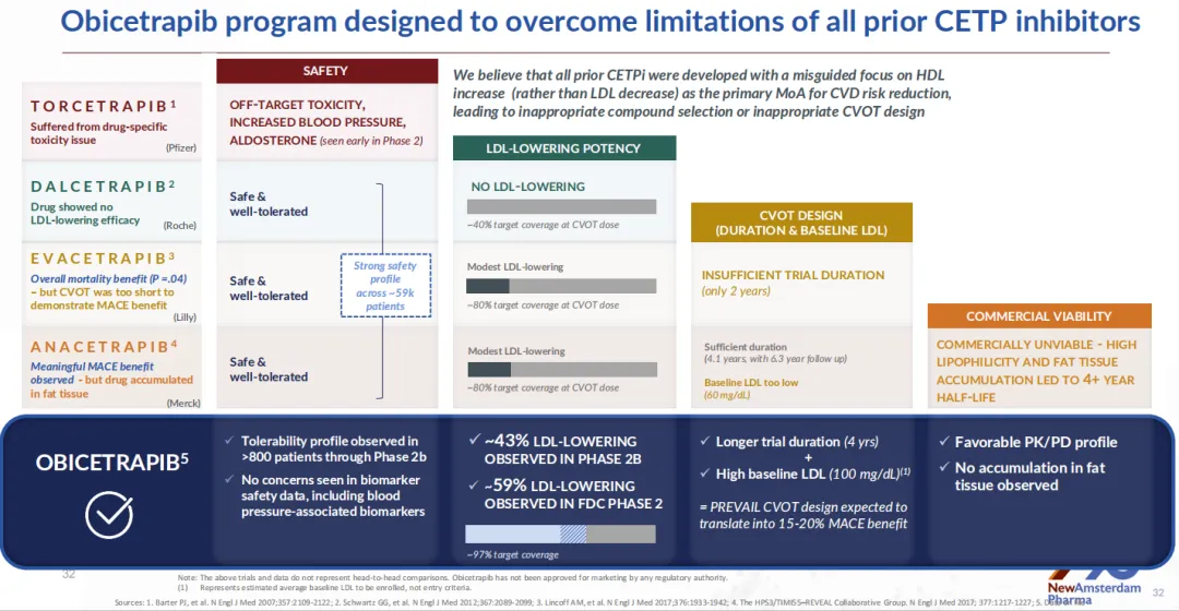 根据NAP披露,与先前的几款CETP抑制剂相比,Obicetrapib具有内在特性,如可电离特性,且亲脂性显著降低,因此该公司认为与其他CETP抑制剂相比,Obicetrapib作为候选药物具有更有利的物理、药代动力学和生物制药特性。将Obicetrapib与等效剂量的anacetrapib和evacetrapib相比,以及10mg剂量的Obicetrapib与100mg剂量的anacetrapib相比,Obicetrapib被证明可以更大程度地降低CETP活性。