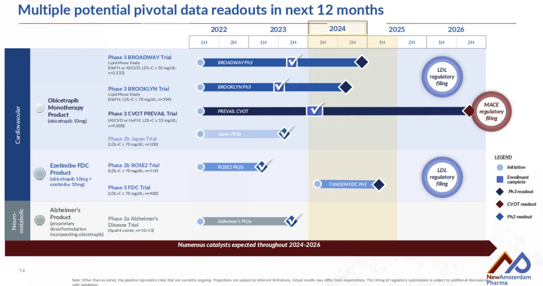 2022年3月,NAP启动了3期CVOT(心血管获益)研究PREVAIL,旨在评估Obicetrapib减少MACE(主要心血管事件,包括心血管疾病死亡、非致死性心肌梗死、非致死性中风和非选择性冠状动脉重建术)发生率的潜力,该研究于2024年4月完成患者入组,随机分配了超过9500名患者,预计将于2026年公布顶线数据。