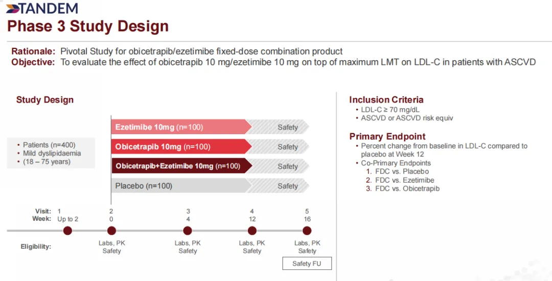对于联合疗法,NAP基于2期ROSE2临床试验的积极结果与经验,以及在2023年上半年完成的Obicetrapib 10 mg + 依泽替米贝10 mg固定剂量组合与原型药物的生物等效性实验,公司在2024年3月启动了关键3期临床试验TANDEM,以评估Obicetrapib 10 mg + 依泽替米贝10 mg固定剂量组合作为饮食控制和最大耐受剂量降脂疗法的辅助治疗,潜在地进一步降低HeFH、ASCVD或ASCVD高风险患者LDL(低密度脂蛋白)水平的能力。该研究计划在美国招募约400名基线LDL-C≥70 mg/dL的患者,预计将在2025年Q1公布顶线数据。NAP的目标是在递交Obicetrapib单药的NDA后不久,再递交一个固定剂量组合的NDA申请。