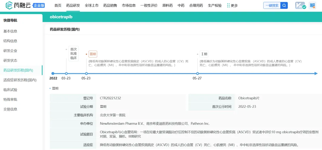 NAP计划在美国、欧盟、日本、中国和英国寻求Obicetrapib的批准。药融云数据www.pharnexcloud.com显示,Obicetrapib在国内正同步进行3期临床研究,主要临床机构为北京大学第一医院。