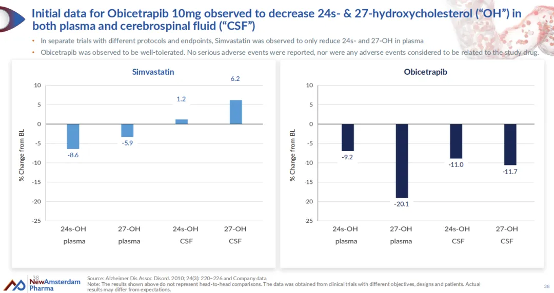 NAP于2022年初开始了一项2a期开放标签和单臂试验,用于早期阿尔茨海默病和载脂蛋白E4(ApoE4)发生自然变异的患者,以评估Obicetrapib的药效学和药代动力学效应、安全性和耐受性,共13例患者给予Obicetrapib 10 mg,随访24周。2023年9月,该公司宣布了该试验初步数据,与基线水平相比,患者脑脊液中24-羟基胆固醇和27-羟基胆固醇的水平分别降低了11%和12%。此外,患者血浆中Aβ42/40比值较基线增加了8%,pTau181水平稳定。