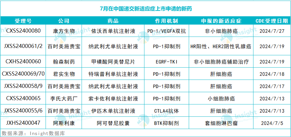 除了上述首次申报上市的新药,7 月还有多款新药递交了新适应症上市申请(详见下表)。限于篇幅,本文不再一一介绍。