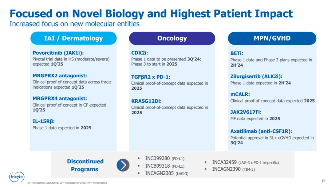 Incyte 宣布对其管线进行战略审查,专注于皮肤病、炎症和自身免疫领域的资产,更加关注具有高潜在影响的项目,包括但不限于: