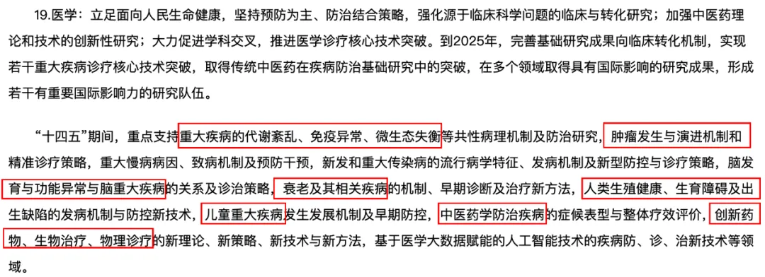 可以看到,十四五期间,国家层面的基础研究重点是这些疾病:重大疾病的代谢紊乱、免疫异常、微生态失衡、肿瘤、脑发育与功能异常与脑重大疾病、衰老及其相关疾病、人类生殖健康、生育障碍及出生缺陷、儿童重大疾病,中医药学防治疾病,创新药物、生物治疗、物理诊疗。