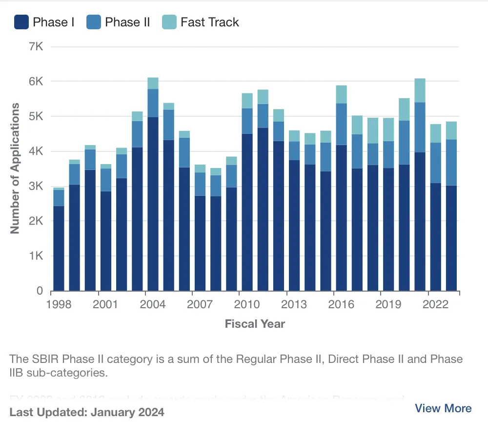 对标一下NIH(美国国立卫生研究院)。2024年,NIH的总经费是471亿美元,其中主要的经费分给旗下各大研究所和美国各大学。旗下通过 SBIR项目投给small busine 2021年达12.3亿美元,分给约900个项目。