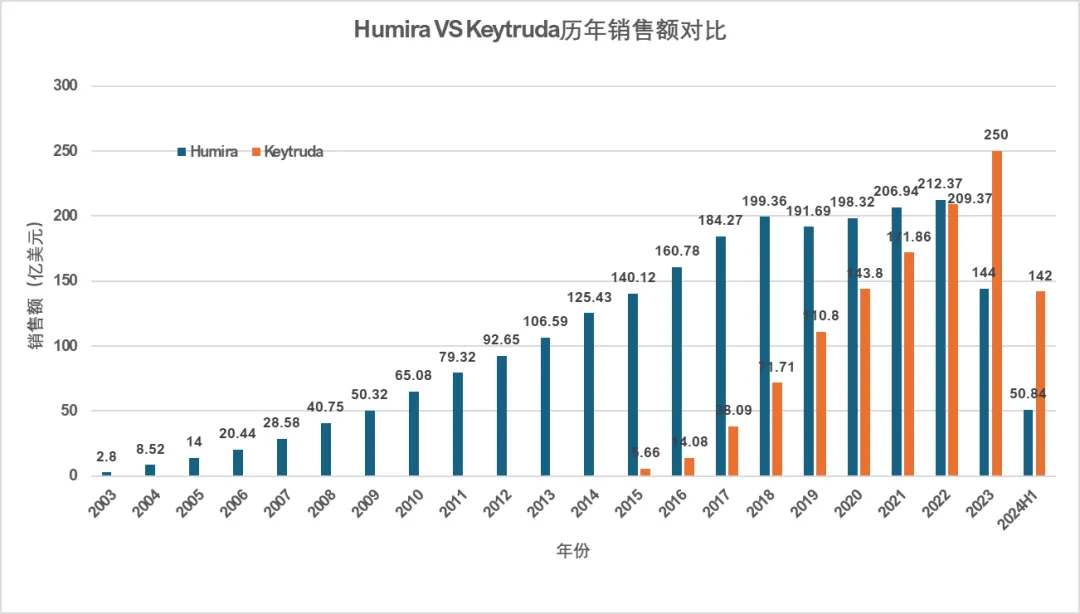 2023年,Keytruda首次以250亿美元的收入,从Humira那里接过“药王”的头衔,终结了这款自免疗法的霸榜记录。