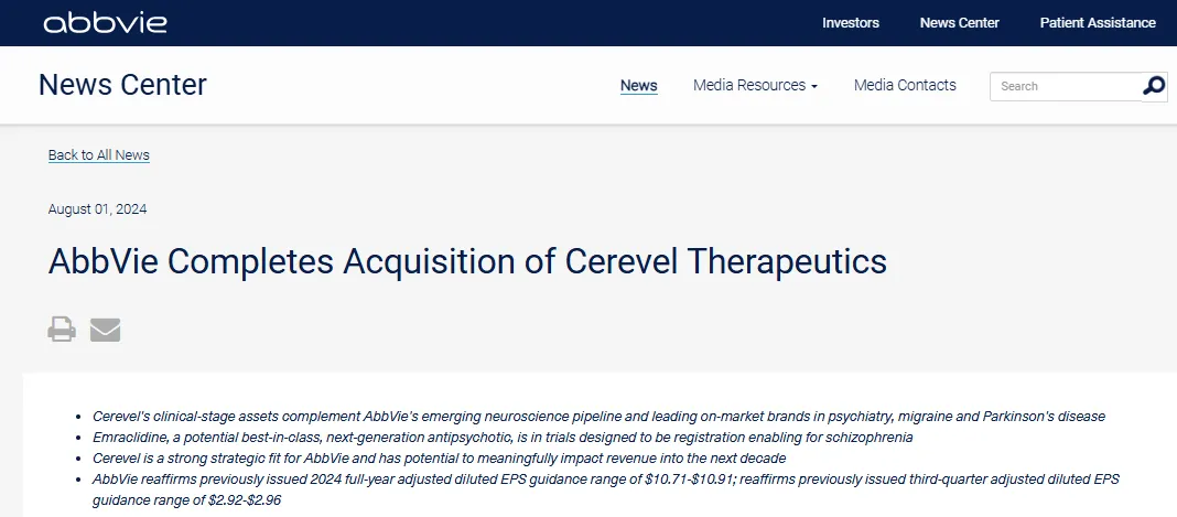 8月1日,艾伯维官网发布消息宣布,其已获得监管部门的批准,将以87亿美元完成对神经科学生物技术公司Cerevel Therapeutics的收购。