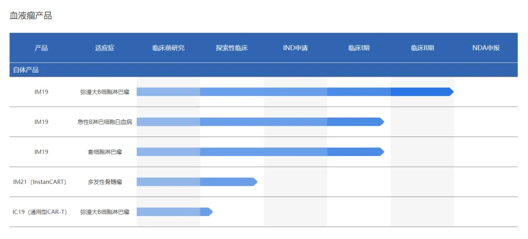 IM19注射液是艺妙神州自主研发的第一款CAR-T细胞治疗产品,先后获得了国家药品监督管理局三个适应症的药物临床试验批准通知书,分别为复发难治弥漫大B细胞淋巴瘤、急性B淋巴细胞白血病和套细胞淋巴瘤,并已全部进入注册临床研究阶段。其中,针对弥漫大B细胞淋巴瘤末线治疗的研究即将完成II期临床试验(确证性临床试验),临床疗效和安全性数据良好,预计于2024年四季度提交药品上市许可申请。