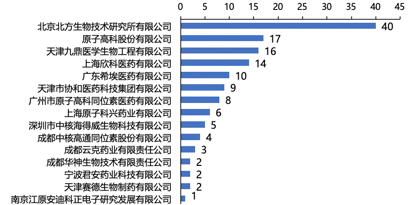 据药智数据不完全统计,目前国内上市的核药152个(按品种计),前15家企业占比91.4%。