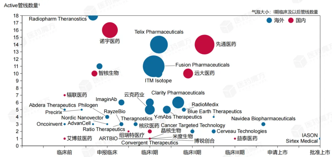 在近五年获融资企业中,Radiopharm和诺宇医药布局管线数量最多,但国内企业发展多处于早期阶段。