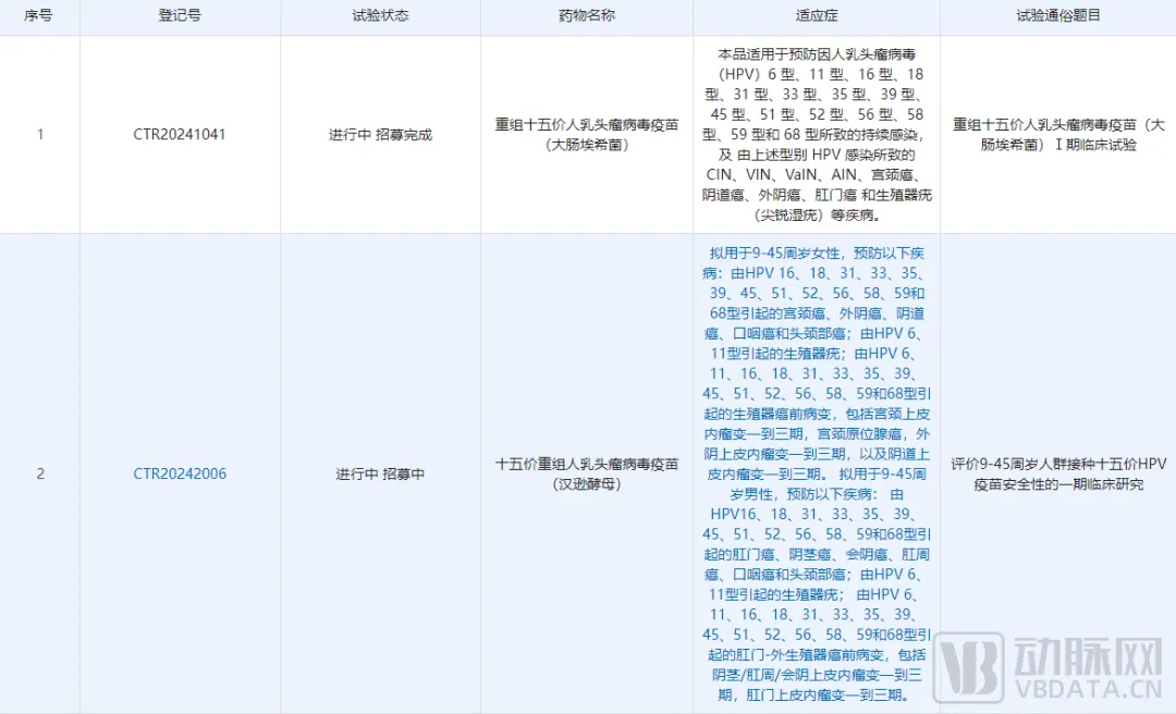 但是,不得不强调的是,开“卷”的九价HPV疫苗市场,还需要面对来自更高价型HPV疫苗的竞争。国内十一价、十四价、十五价价型HPV疫苗正在临床试验中。例如,以十五价价型HPV疫苗为例,康乐卫士与辽宁成大生物股份有限公司合作研发的重组十五价人乳头瘤病毒疫苗(大肠埃希菌)(“十五价 HPV 疫苗”),已完成一期临床试验准备工作,并已于2024年3月28日正式启动一期临床试验。此外,根据CDE的数据,上海博唯生物科技有限公司目前也在进行十五价HPV疫苗的临床试验。