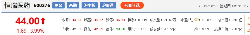 截止今日发稿,恒瑞医药股票上涨近4%!