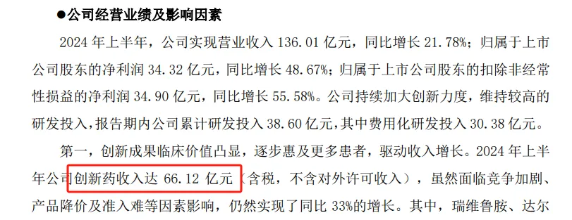 今年上半年,恒瑞医药创新药实现收入66.12亿元,虽然面临竞争加剧、产品降价及准入难等因素影响,仍然实现了同比33%的增长。另外,创新药出海取得成效,成为业绩增长的第二引擎。报告期内,恒瑞医药已将收到的德国默克公司1.6亿欧元对外许可首付款确认为收入。经估算,两项创新药收入总和占总营收比重已过半。