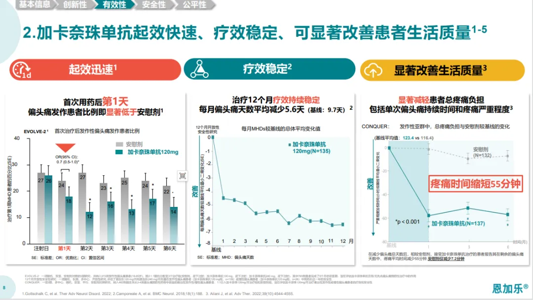 从适应症上来看,两者有一些互补的关系:加卡奈珠单抗用于预防成人偏头痛,而瑞美吉泮适用于成人有或无先兆偏头痛的急性治疗。这两款药物对患者来说显然都有巨大获益,双管齐下可降低疾病发作率,以及缓解头痛发作时的症状。