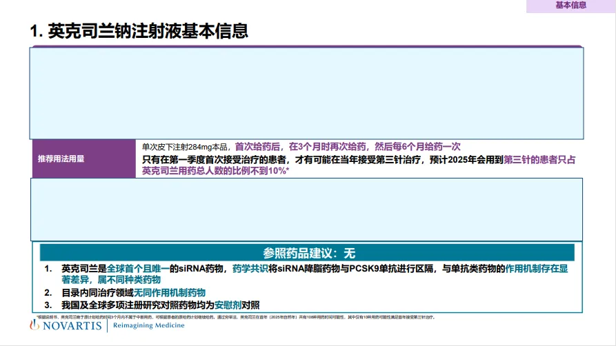再往下看,英克司兰使用了3页PPT详述其创新性,从产品机制、药学特性、临床价值等多方面进行阐述,以小干扰RNA为核心卖点,尽最大可能挖掘其独特性;接下来在安全性和有效性的表述上,诺华尽显一线MNC大厂的雄厚实力,从RCT、RWE、META-Analysis、上市后研究等角度阐述产品价值。然而,令人略有不解的是,英克司兰在这些部分中,总时不时把PCSK9单抗类药物拉出来作比较,与之前建议无参照药有些偏离,这也许是诺华的plan B。