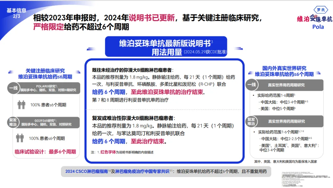 首先,全方位突出用法用量,甚至单独占用一页,展示说明书已更新,“给药 6 个周期,至此维泊妥珠单抗的治疗结束”。