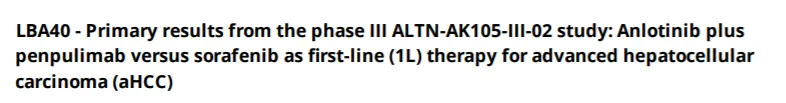 ALTN-AK105-III-02研究的主要结果入选LBA,这是一项安罗替尼(anlotinib)联合派安普利单抗(penpulimab)对比索拉非尼(sorafenib)一线治疗晚期肝细胞癌的3期临床研究。