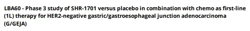 SHR-1701对比安慰剂联合化疗作为HER2阴性胃/胃食管交界处腺癌(G/GEJA)一线治疗的3期研究入选LBA。公开资料显示,SHR-1701是恒瑞医药研发的一种靶向PD-L1和TGF-β的新型双功能融合蛋白,可以促进效应性T细胞的活化,同时还可有效改善肿瘤微环境中的免疫调节作用,最终有效促进免疫系统对于肿瘤细胞的杀伤。该产品目前正在开展针对胃癌、胃癌围手术期治疗、宫颈癌一线治疗等的3期临床研究。