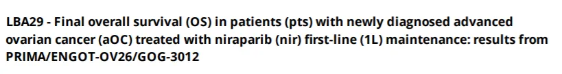 接受尼拉帕利(niraparib)一线维持治疗的新诊断晚期卵巢癌患者的最终总生存期(OS):来自PRIMA/ENGOT-OV26/GOG-3012的结果入选LBA。公开资料显示,PRIMA是一项双盲、随机3期研究,旨在评估尼拉帕尼与安慰剂在一线III期或IV期卵巢癌患者中的疗效,该研究评估了尼拉帕尼作为维持治疗的有效性和安全性。PRIMA研究此前已经证实,无论生物标记物状态如何,使用PARP抑制剂尼拉帕利维持治疗可获得显著的PFS获益。