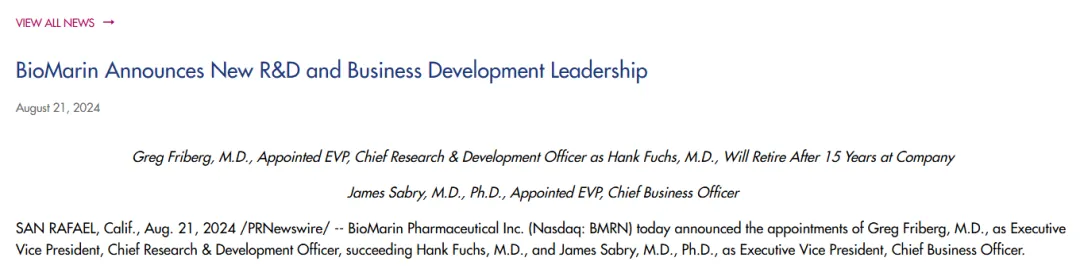 8月21日,BioMarin宣布Greg Friberg博士将于2024年9月30日接替Hank Fuchs博士任执行副总裁兼首席研发官,James Sabry博士将于2024年10月7日担任执行副总裁兼首席商务官。