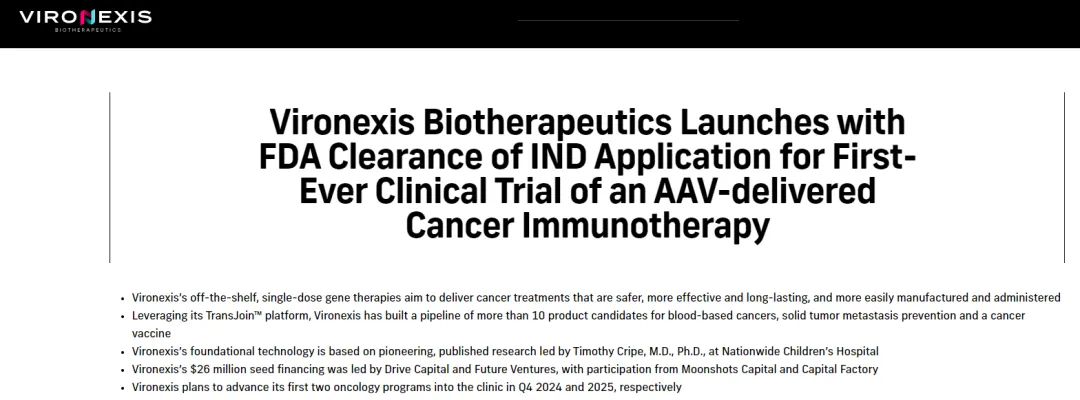 与此同时公司获得了2600万美元(约1.85亿元)的种子基金,本轮融资由Drive Capital和Future Ventures领投,Moonshots Capital和Capital Factory 参投。这些投资者支持Vironexis的使命,即开发现货型单剂量基因疗法,以更有效、更安全、更持久地治疗癌症。