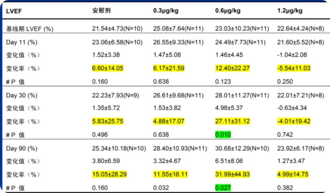 临床数据上,二者可以根据共同公布的数据指标LVEF(左室射血分数,本身是个百分数)来比较二者的疗效。纽卡定的LVEF数据如下表所示,疗效最显著,P值最小(数据最具有统计学价值)的组为0.6μg/kg剂量组,在30天时,其LVEF的变化值为4.98%,90天时,主变化值为6.51%。