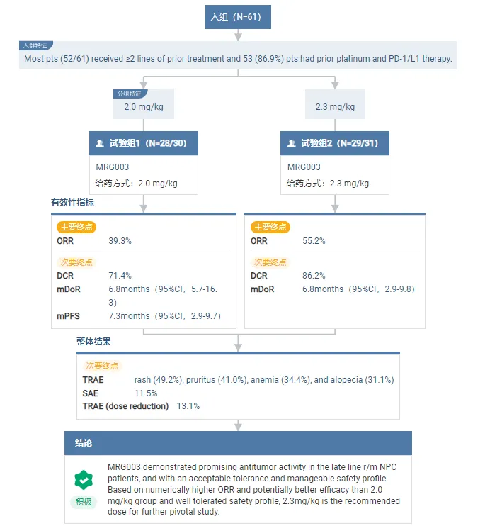 共有 61 名患者接受了至少 1 剂 MRG003,其中 30 名患者接受 2.0 mg/kg (DL1) 剂量治疗,31 名患者接受 2.3 mg/kg (DL2) 剂量治疗。大多数患者 (52/61) 接受过 ≥2 线的先前治疗,53 名 (86.9%) 患者接受过先前铂类和 PD-1/L1 治疗。