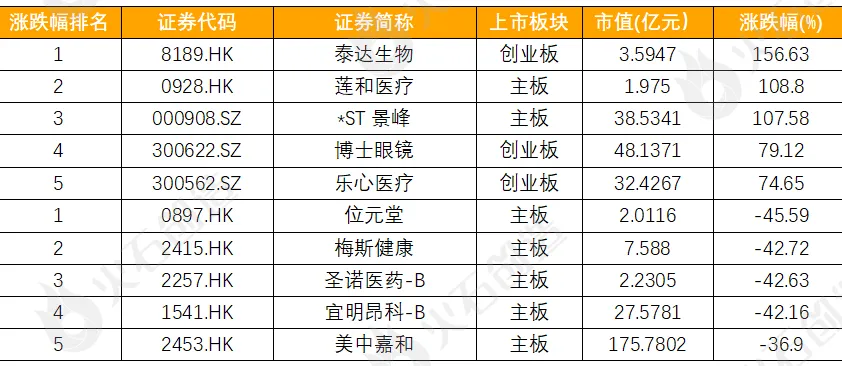 同上月相比,泰达生物、莲和医疗、*ST景峰、博士眼镜、乐心医疗的涨幅较大,其中泰达生物(8189)市值涨幅高达156.63%,莲和医疗(0928)市值涨幅达108.8%,*ST景峰(000908)市值涨幅达107.58%;位元堂、梅斯健康、圣诺医药-B、宜明昂科-B、美中嘉和的跌幅较大,其中位元堂(0897)市值跌幅达45.59%,梅斯健康(2415)市值跌幅达-42.72%,圣诺医药-B(2257)市值跌幅达42.63%。