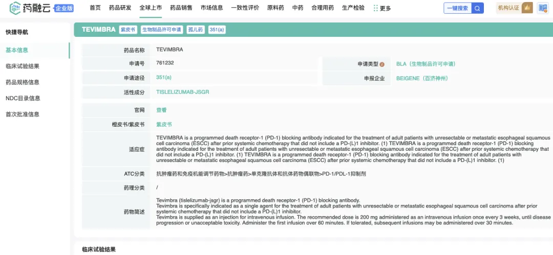 2024年3月13日,美国FDA已经批准来自中国企业百济神州的替雷利珠单抗(中文商品名:百泽安®;英文商品名:TEVIMBRA®)作为单药治疗既往接受过系统化疗(不含PD-1/L1抑制剂)后不可切除或转移性食管鳞状细胞癌(ESCC)的成人患者。(2线适应症)