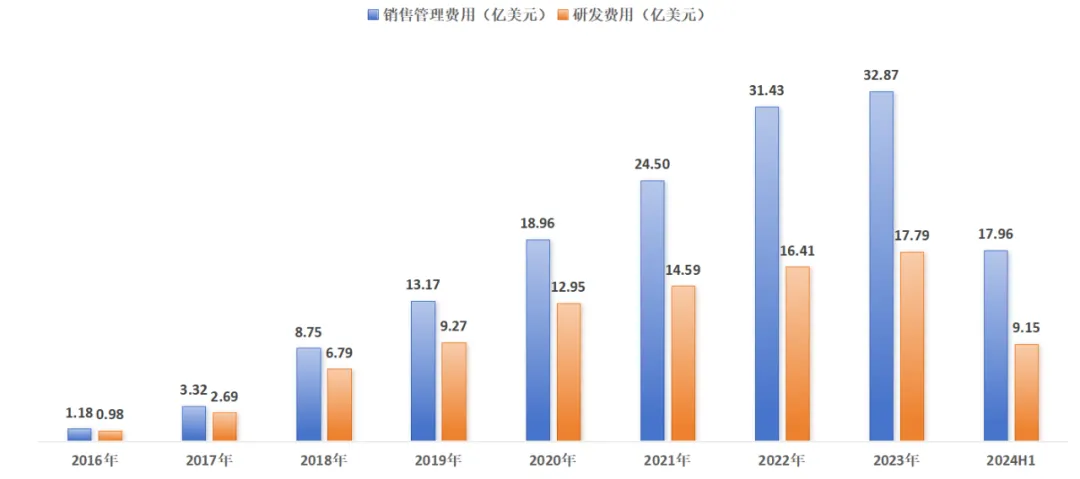 百济神州虽然仅用半年时间就在美国市场取得8.31亿美元的泽布替尼销售额,但这却几乎是耗费147.64亿美元所建立的(2019年至2024年中报总经营支出)。仅今年上半年,百济神州的总经营支出就高达17.96亿美元,不要说花这么多钱了,就算是能一次性拿出这么多钱的中国药企都没有几家。